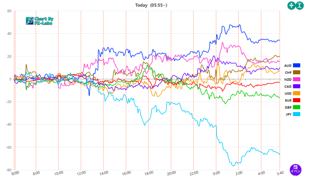上は、9日の通貨強弱。ロンドン時間開始とニューヨーク時間に円に売りが出ました。