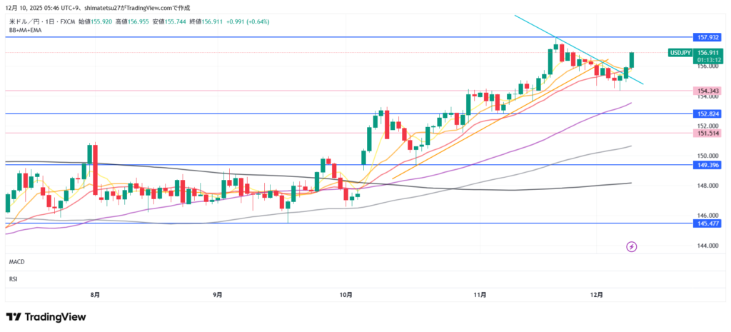 ドル円の日足チャート。12/10 6:00のレートは156.89。高値の下がりラインを超えました。クロス円全体が円安となっています。