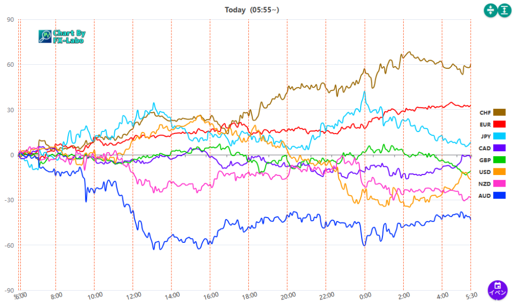 上は、11日の通貨強弱。豪ドルが売り、スイスフランが買いとなりました。ニューヨーク時間は円高ドル安となりました。