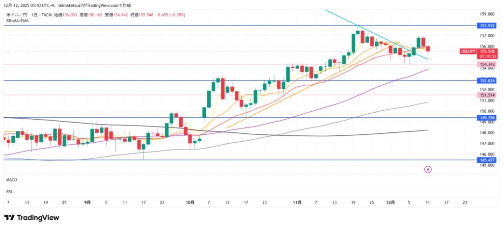 ドル円の日足チャート。12/12 6:00のレートは155.55。連続陰線で20MA下。注目のラインは下は154.3となりますが、昨日は155.0で反発しています。