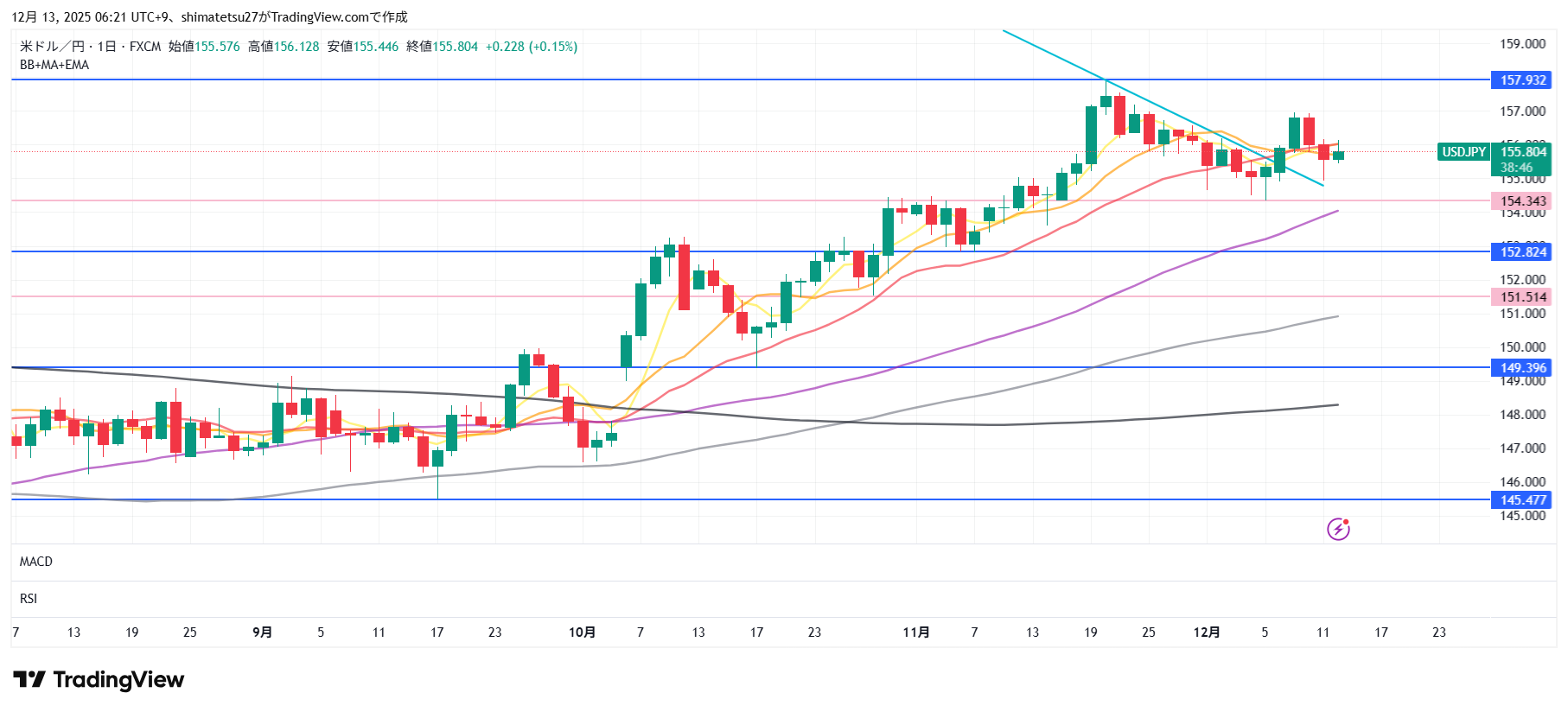 ドル円の日足チャート。12/13 6:00のレートは155.80。20MA下。注目のラインは下が154.3、上は157.9ですが、11日は157円で反発しています。