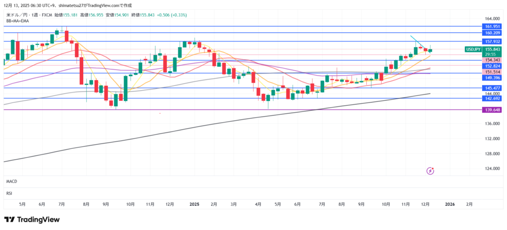 ドル円の週足。12月8日の週は上ヒゲの短い陽線。2025年1月から4月後半まで下落、その後上昇となっていましたが直近は下がり傾向