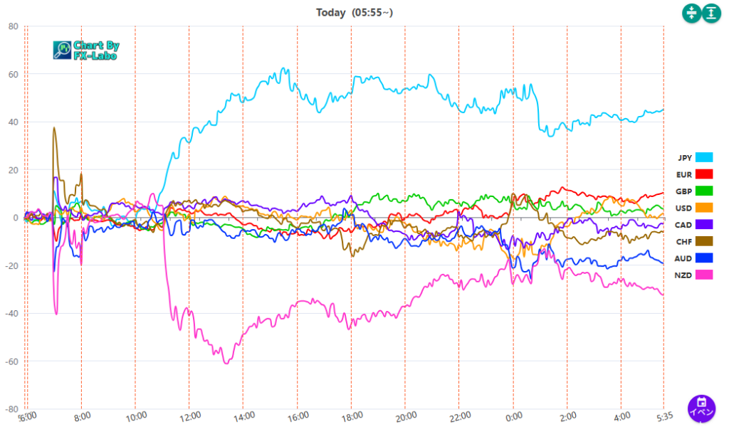 上は、15日の週の通貨強弱。円が買い、ニュージーランドドルが売りとなっています。