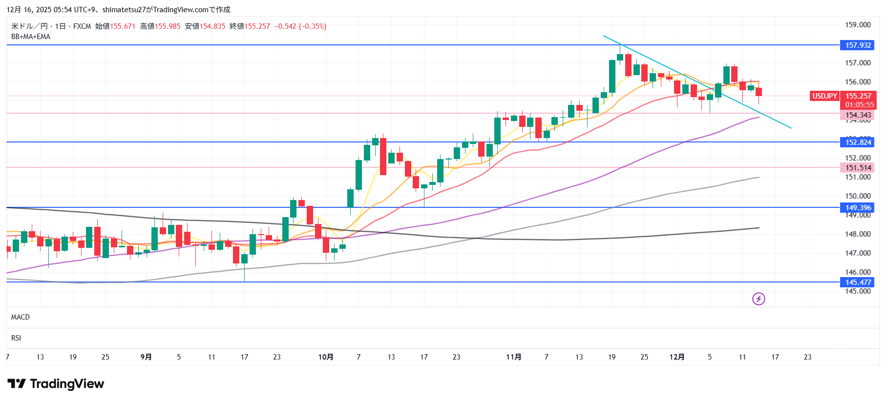 ドル円の日足チャート。12/16 6:00のレートは155.25。20MA下。注目のラインは下が154.3、上は157.9ですが、11日は157円で反発しています。