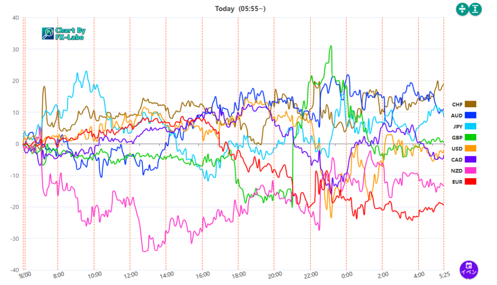 上は、18日の週の通貨強弱。主要通貨は小動き。