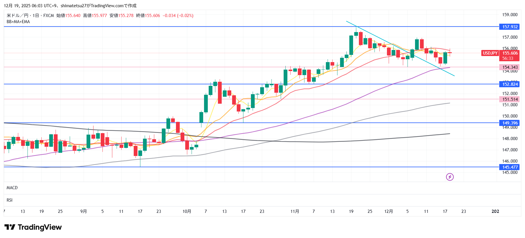 ドル円の日足チャート。12/19 6:00のレートは155.60。注目のラインは下が154.3、上は157.9となります。20MAはやや下がりました。