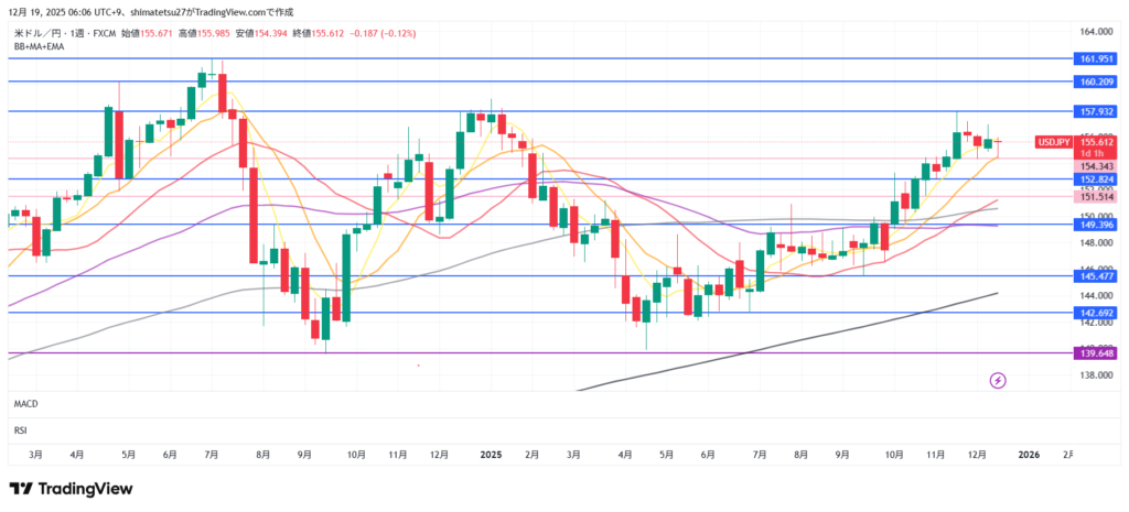 ドル円の週足。12月15日の週は実体の短い陰線。2025年1月から4月後半まで下落、その後上昇となっていましたが直近は下がり傾向
