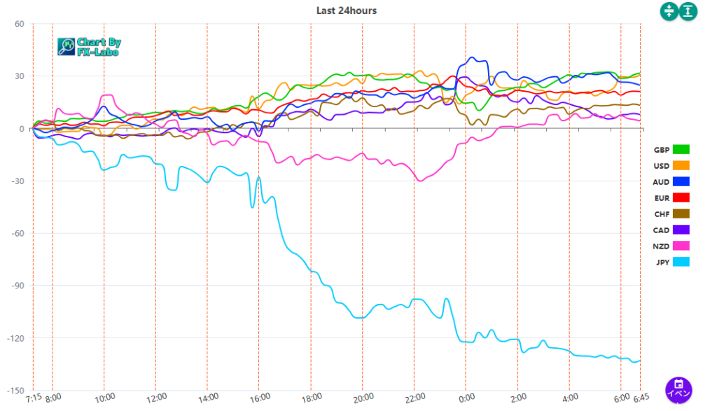 上は、19日の週の通貨強弱。日銀総裁の会見後、円売り。