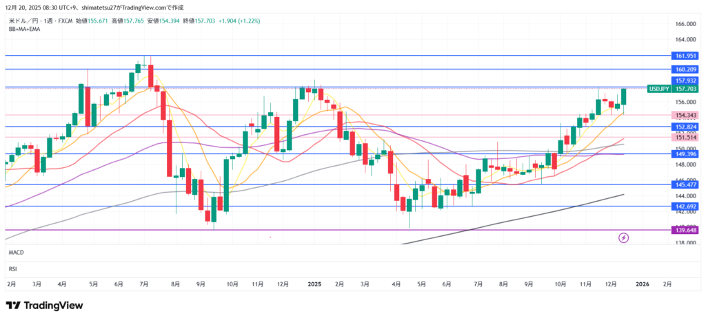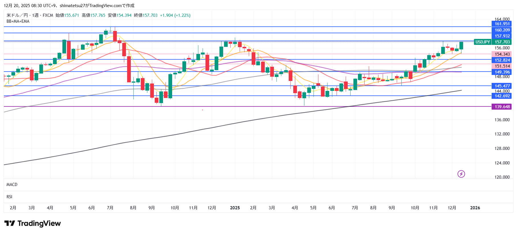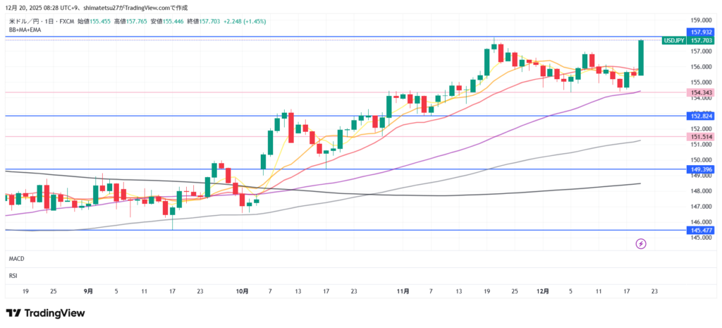 ドル円の日足チャート。12/20 7:00のレートは157.70。大きく上昇し、上のラインの157.9の手前です。
