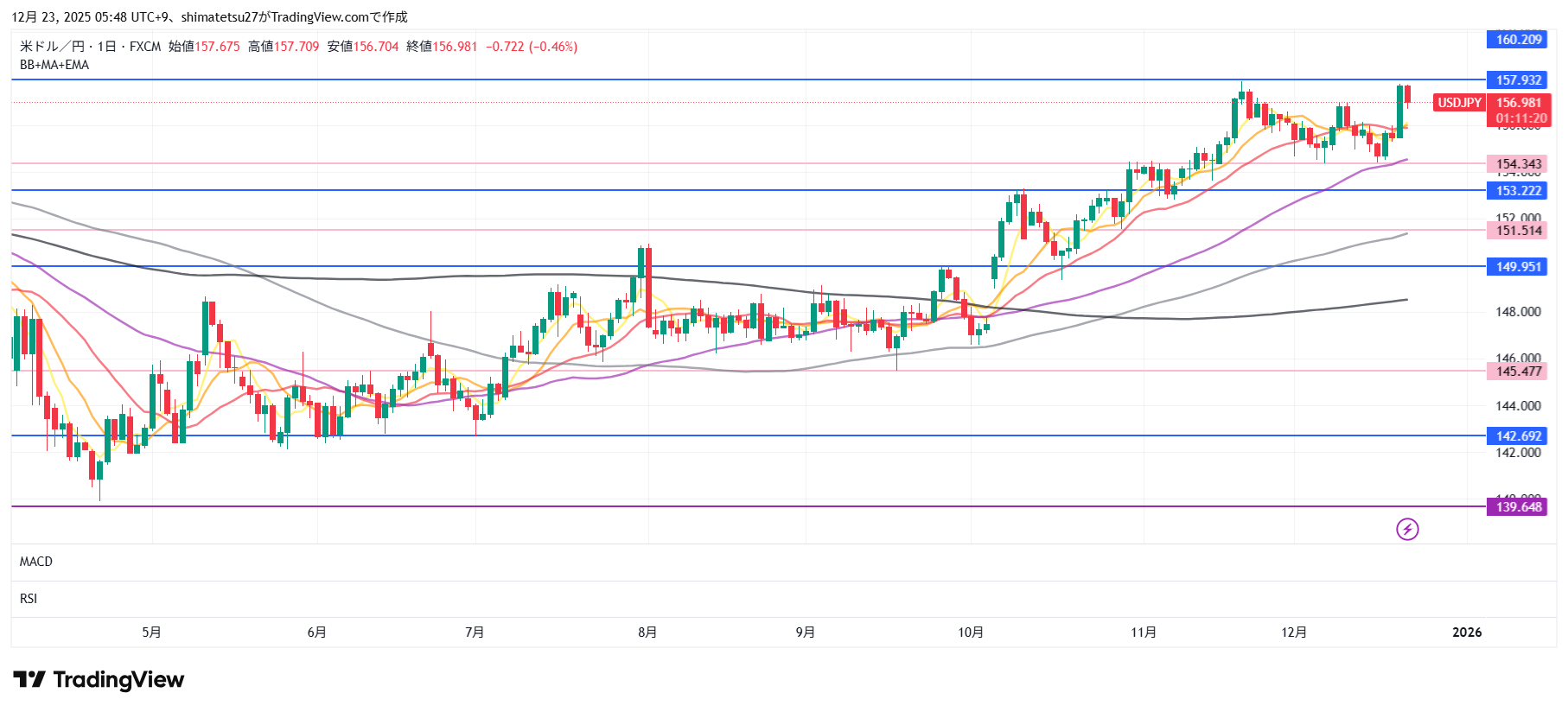 ドル円の日足チャート。12/22 6:00のレートは156.97。上のラインの157.9の手前から下落しました。