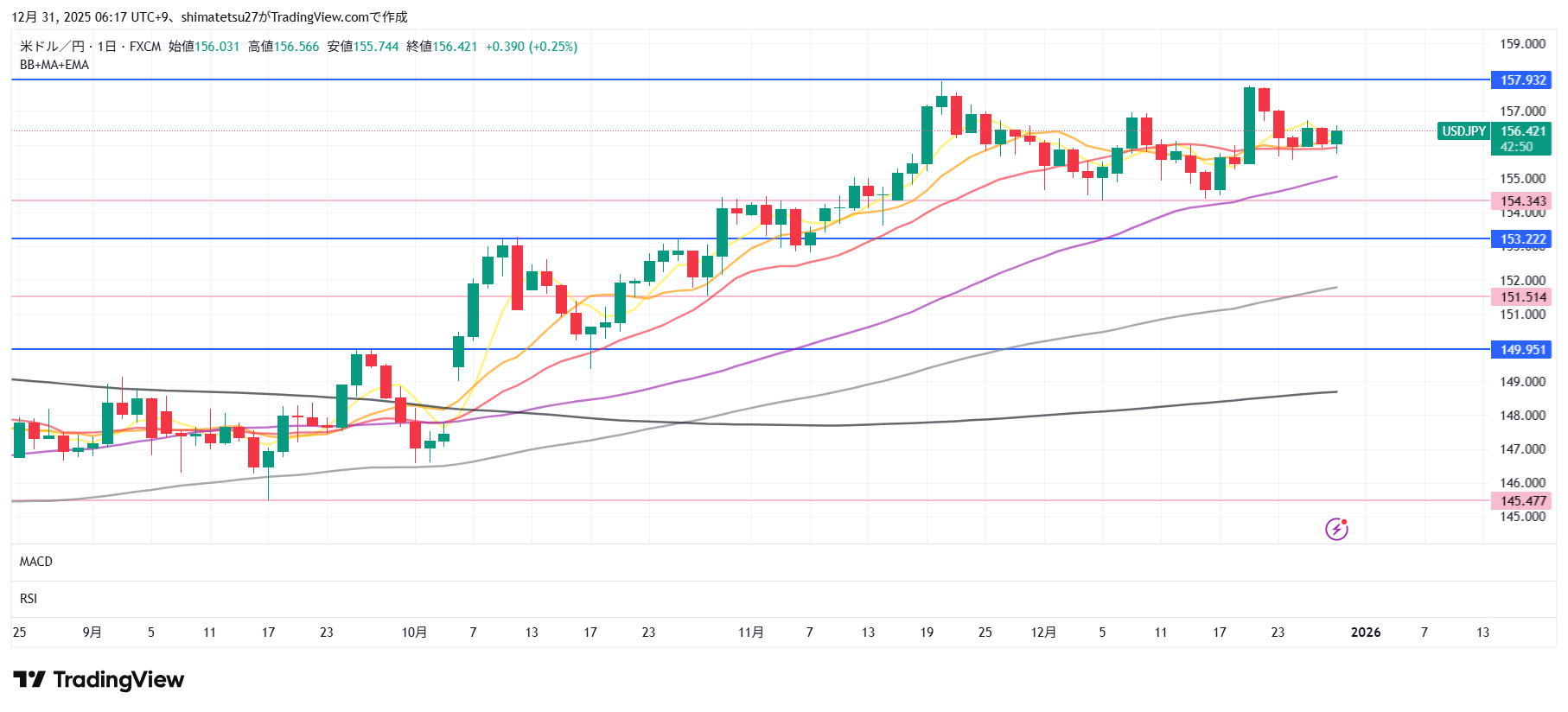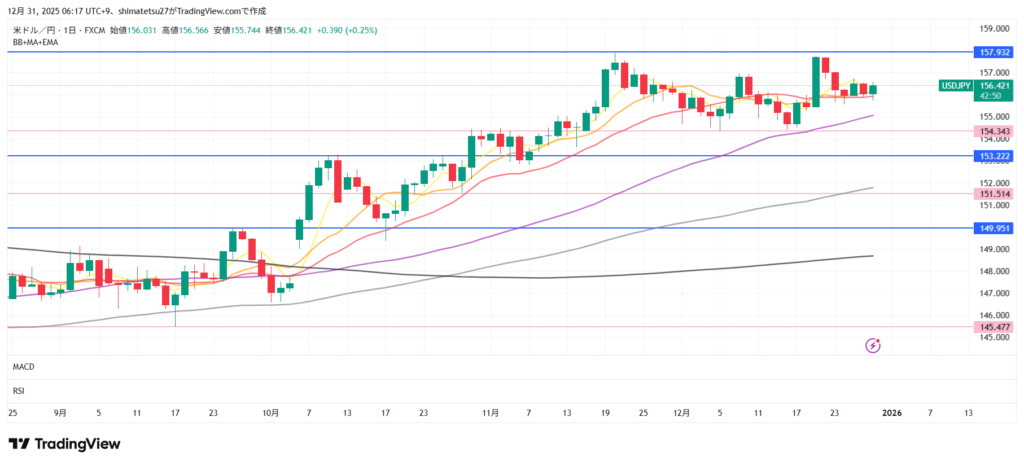 ドル円の日足チャート。12/31 6:00のレートは156.42。上のラインの157.9と下のラインの154.34のレンジとなっています。