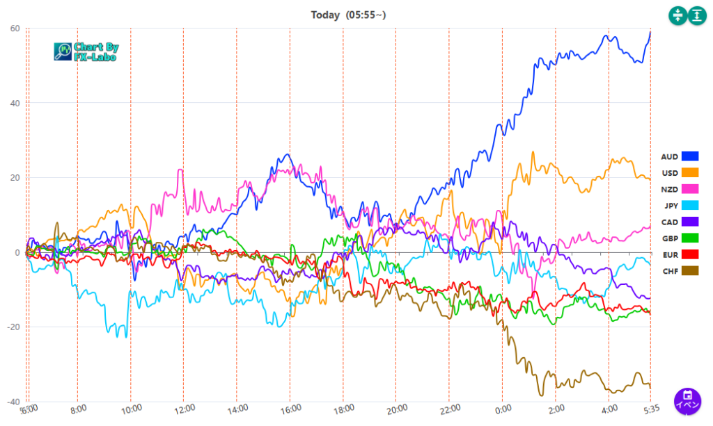 上は、6日の通貨強弱。ニューヨーク時間に豪ドルが買い、スイスフランがが売りとなりました。