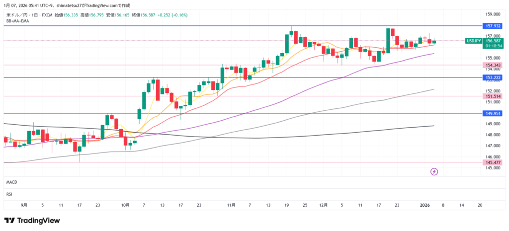 ドル円の日足チャート。1/7 6:00のレートは156.60。上のラインの157.9と下のラインの154.34のレンジとなっています。