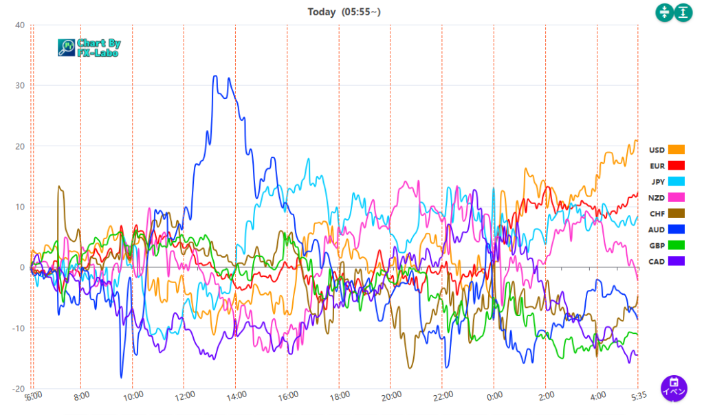 上は、7日の通貨強弱。東京時間に豪ドルに買いが出た以外は小動きとなりました。