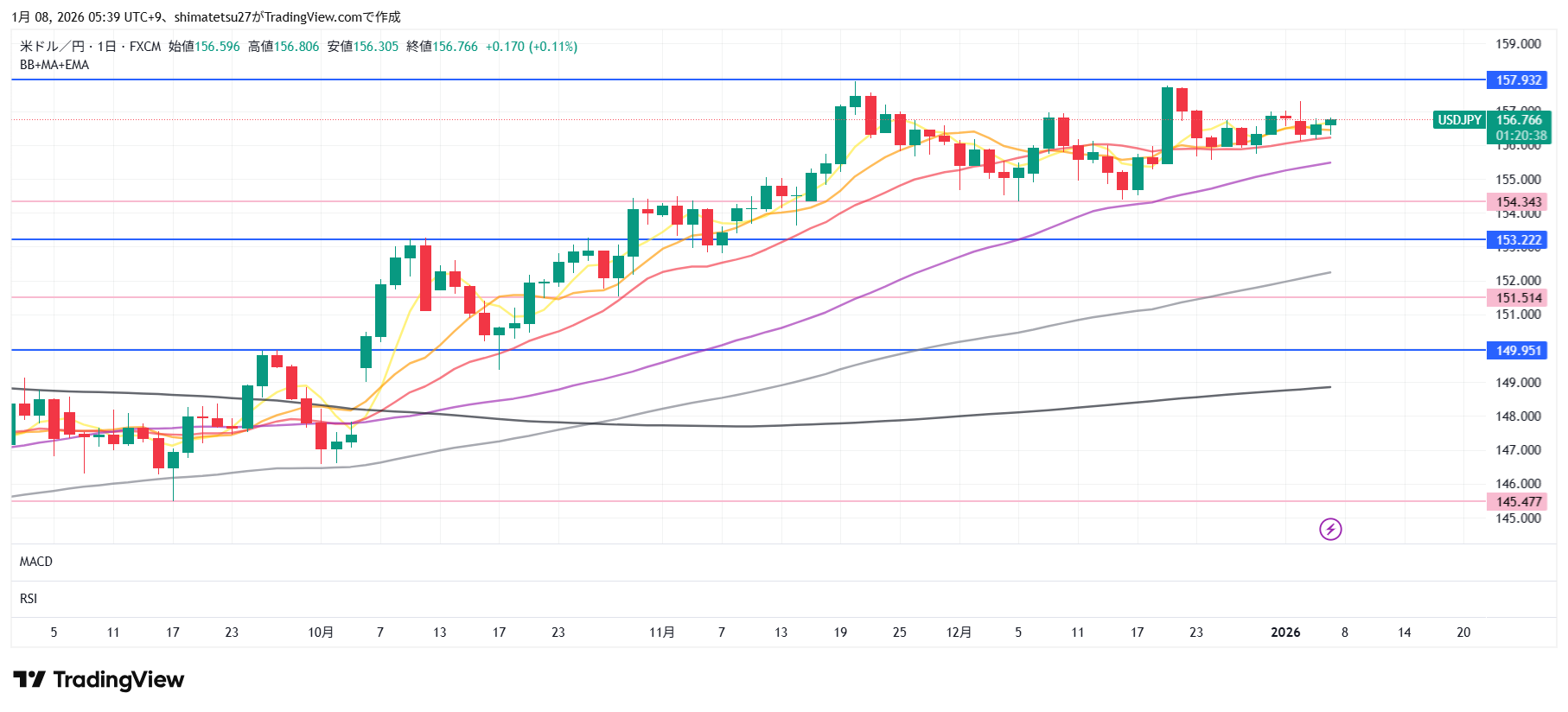 ドル円の日足チャート。1/8 6:00のレートは156.76。上のラインの157.9と下のラインの154.34のレンジとなっています。