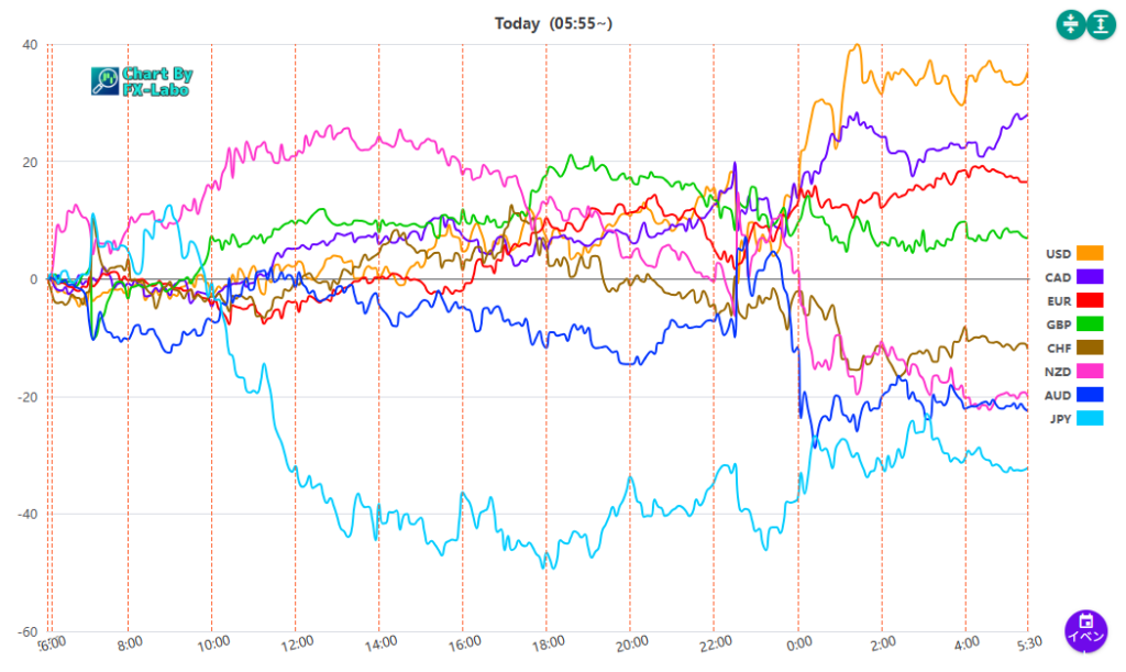 上は、13日の通貨強弱。東京時間に円が売り、ニューヨーク時間にドルが買いとなりました。