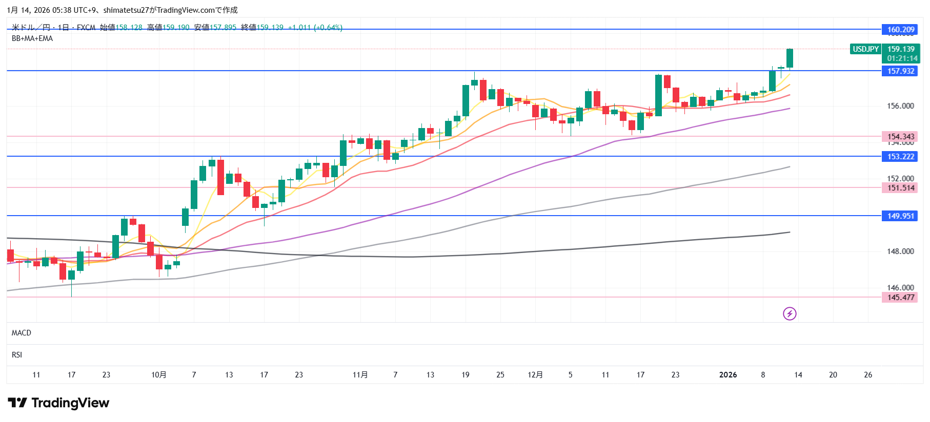 ドル円の日足チャート。1/14 6:00のレートは159.14。次の上のラインは160.21。さらに上昇するか見ていきます。下のラインの154.34。