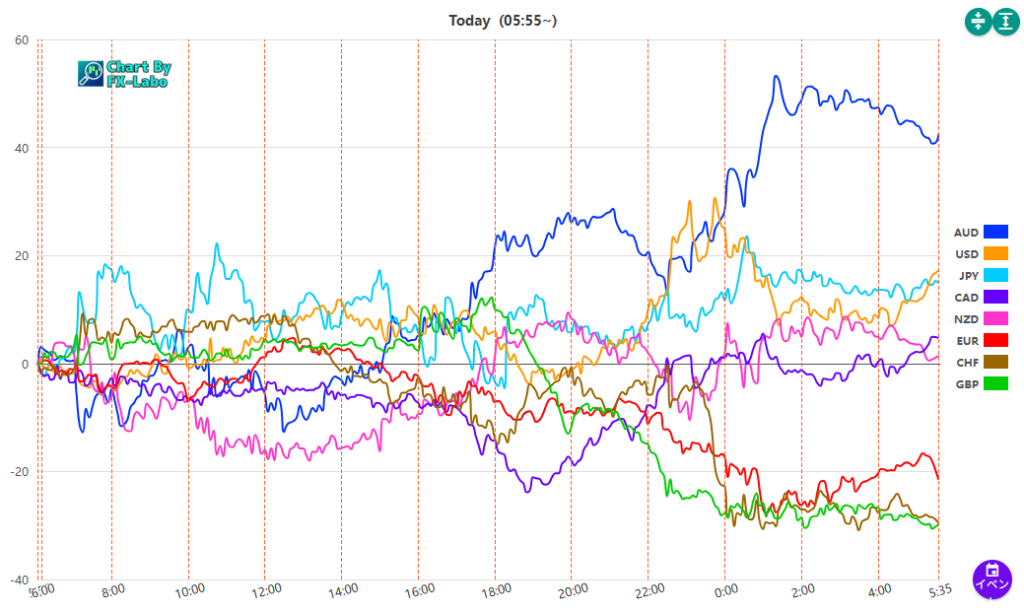 上は、15日の通貨強弱。ニューヨーク時間に豪ドルが買いとなりました。