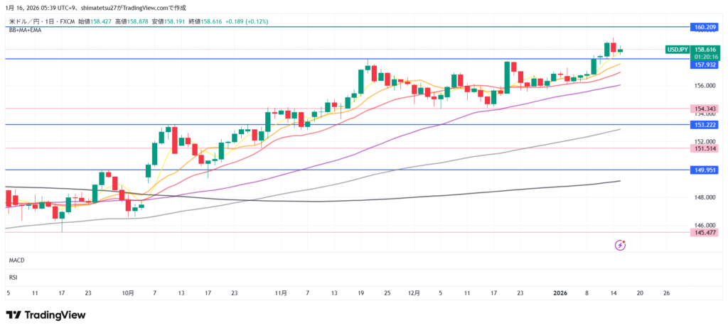 ドル円の日足チャート。1/16 6:00のレートは158.61ほぼ停滞。次の上のラインは160.21。下のラインの154.34。