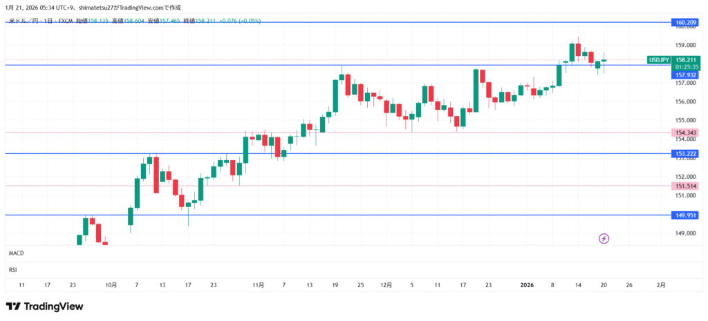 ドル円の日足チャート。1/20 6:00のレートは158.21。次の上のラインは160.21。下のラインの154.34。157.9のラインを上下しました。