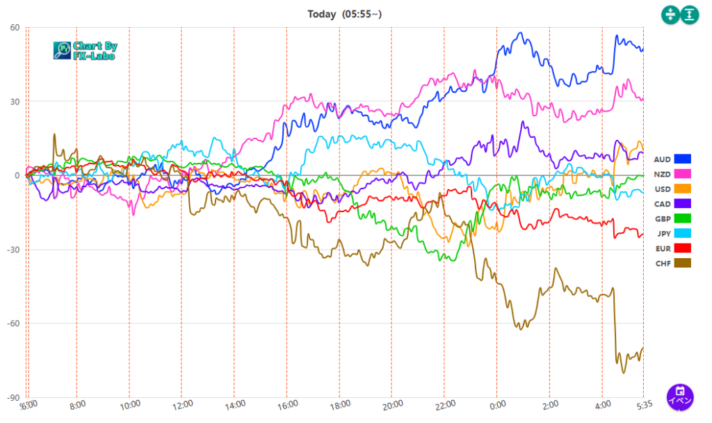 上は、20日の通貨強弱。ロンドン時間以降に豪ドルが買い、スイスフランが売りとなりました。
