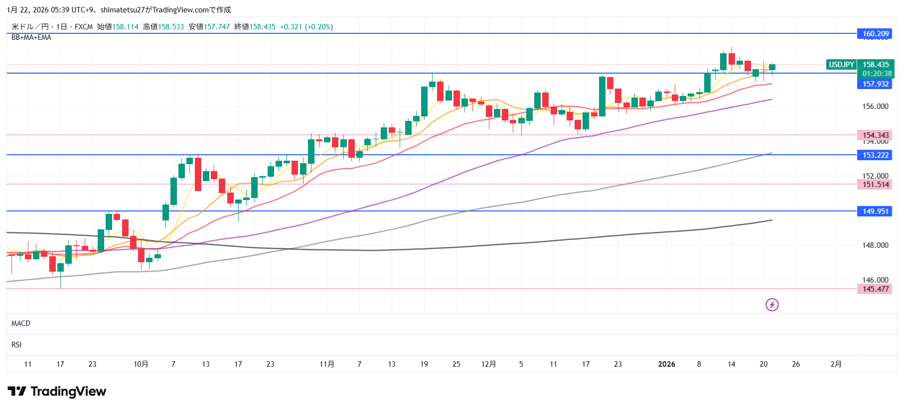 ドル円の日足チャート。1/20 6:00のレートは158.43。次の上のラインは160.21。下のラインの154.34。157.9のラインの上に来ました。