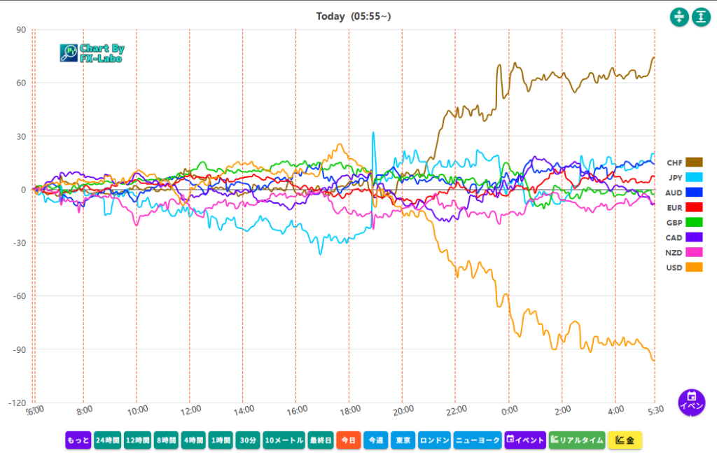 上は、27日の通貨強弱。ニューヨーク時間にスイスフランが買い、ドルが売りとなっています。