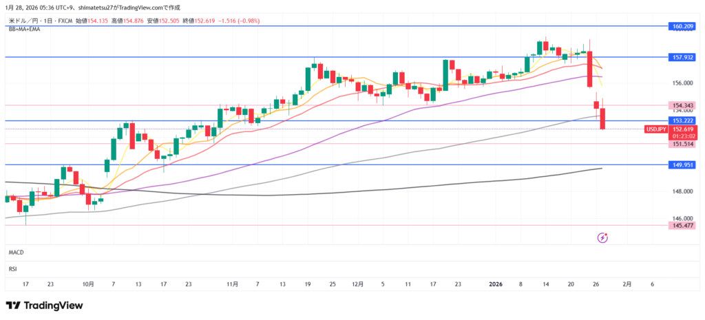 ドル円の日足チャート。1/28 6:00のレートは152.61。27日のニューヨーク時間に下落があり、153.22のラインを割りました。上のラインは157.93。さらに下落すると意識されるラインは151.51となります。