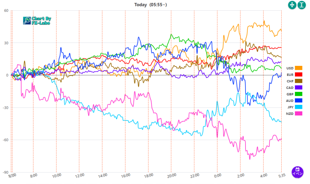 上は、4日の通貨強弱。円・ニュージードルが売り、ニューヨーク時間にドル買いとなりました。