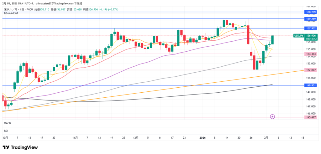 ドル円の日足チャート。2/4 6:00のレートは156.90。上のラインは157.93。下のラインは154.34となります。