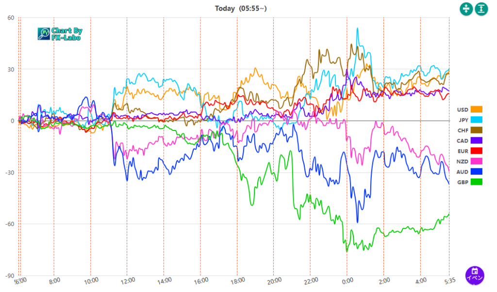 上は、5日の通貨強弱。ニューヨーク時間に円とスイスフランふが買い、豪ドルとポンドが売りとなりました。