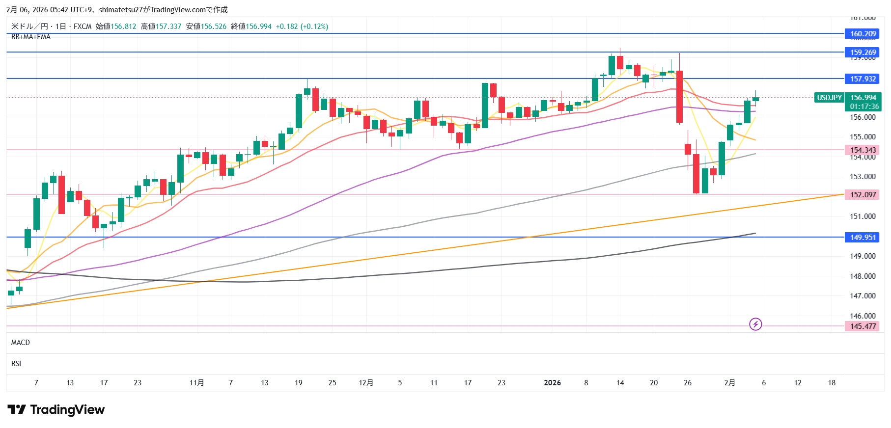 ドル円の日足チャート。2/6 6:00のレートは156.98。上のラインは157.93。下のラインは154.34となります。