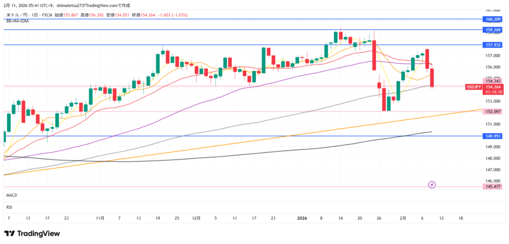 ドル円の日足チャート。2/11 6:00のレートは155.25。上のラインは157.93。注目する下のライン154.34に到達しました。この後の動きに注目します。さらに下は152.10となります。
