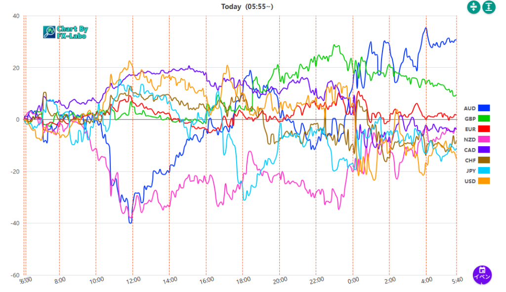 上は、20日の通貨強弱。東京時間は豪ドルとニュージードルが売り、ロンドン時間にポンドが買い円が売り、ニューヨーク時間に豪ドルが買いとなりました。