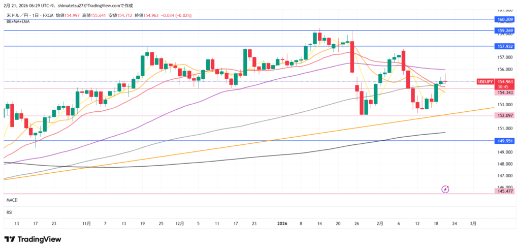 ドル円の日足チャート。2/21 6:00のレートは154.96。上のラインは157.93。注目するライン154.34を上に抜けました。この後の動きに注目します。さらに下は152.10となります。