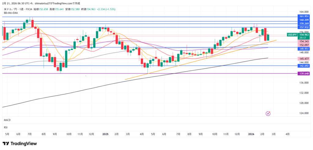 ドル円の週足。2月16日の週は陽線。2025年1月から4月後半まで下落、その後上昇、2026年1月より下落傾向。AIバブル懸念や介入警戒があります。