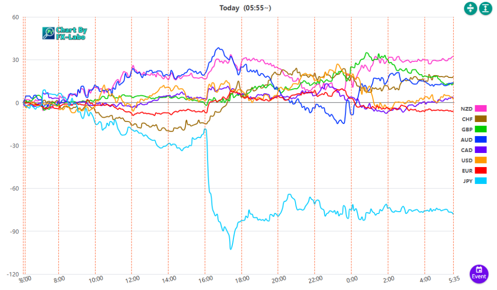 上は、24日の通貨強弱。ロンドン時間に円が売りとなりました。