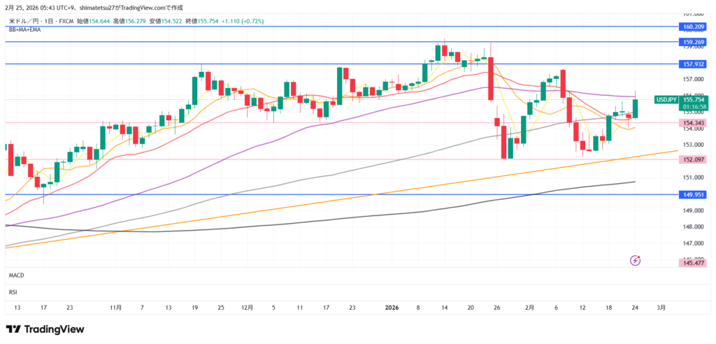 ドル円の日足チャート。2/25 6:00のレートは155.75。上のラインは157.93。下は154.34となります。