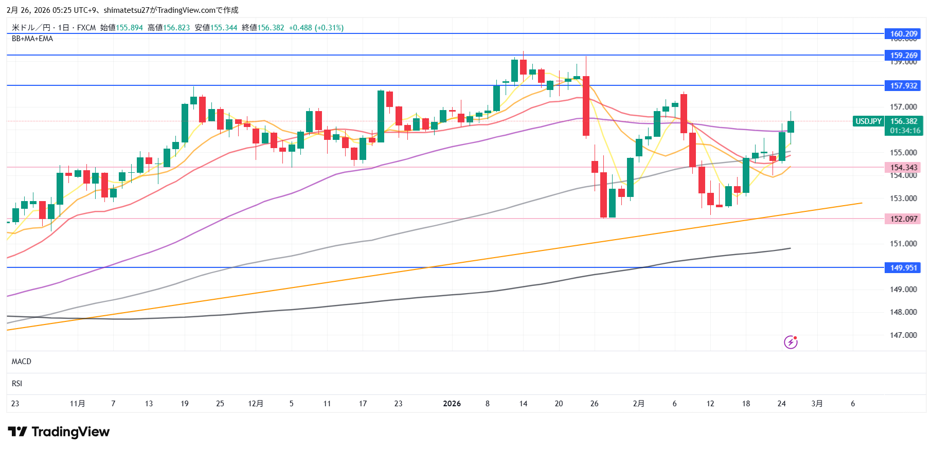 ドル円の日足チャート。2/26 6:00のレートは156.42。上のラインは157.93。下は154.34となります。