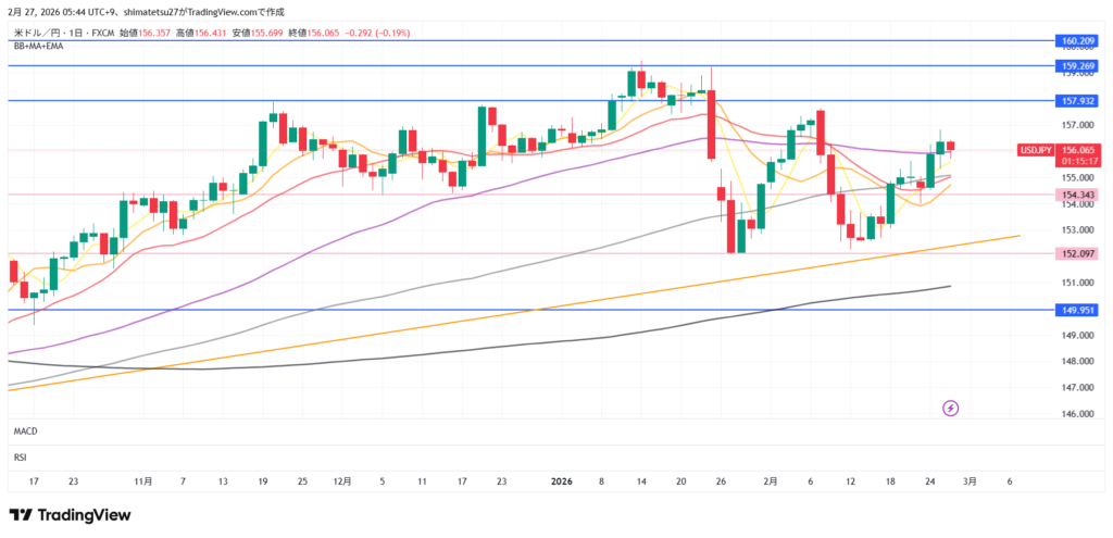 ドル円の日足チャート。2/27 6:00のレートは156.07。上のラインは157.93。下は154.34となります。