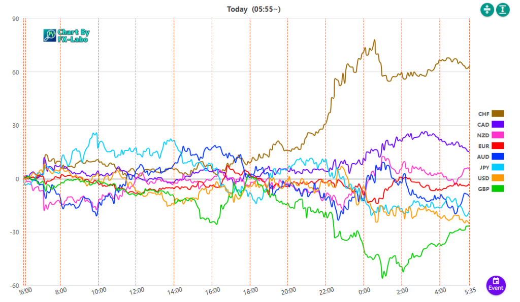 上は、28日の通貨強弱。ニューヨーク時間にスイスフランが買い、ポンドが売りとなりました。