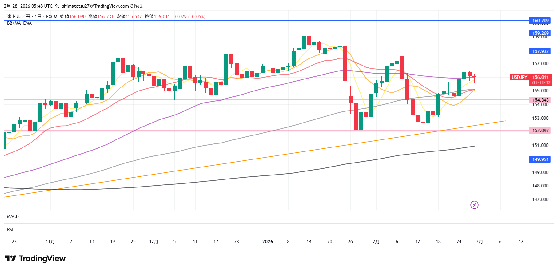 ドル円の日足チャート。2/28 6:00のレートは156.01。上のラインは157.93。下は154.34となります。