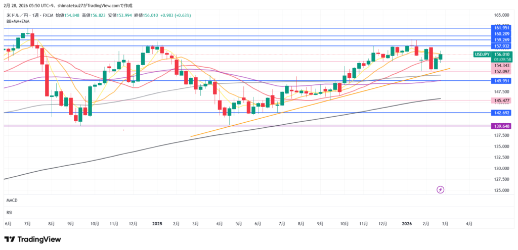 ドル円の週足。2月23日の週は陽線。2025年1月から4月後半まで下落、その後上昇、2026年1月より下落傾向。AIバブル脅威論や介入警戒があります。