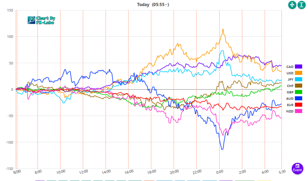上は、3日の通貨強弱。すごいボラティリティ。ドル・カナダドル・円が買い。豪ドル・ニュージーが売りとなりました。