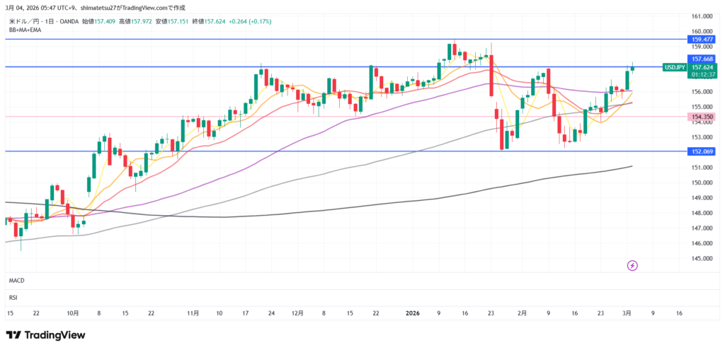 ドル円の日足チャート。3/4 6:00のレートは157.62。上のラインは157.67。下は154.35となります。ここから上はレートチェックや介入が警戒されるレベル。