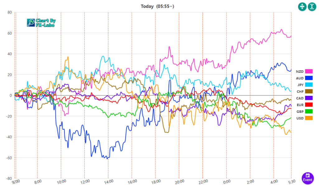 上は、4日の通貨強弱。東京時間に豪ドルが売り、ニューヨーク時間にニュージーが買いとなりました。