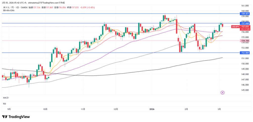 ドル円の日足チャート。3/5 6:00のレートは157.02。上のラインは157.67。下は154.35となります。ここから上はレートチェックや介入が警戒されるレベル。