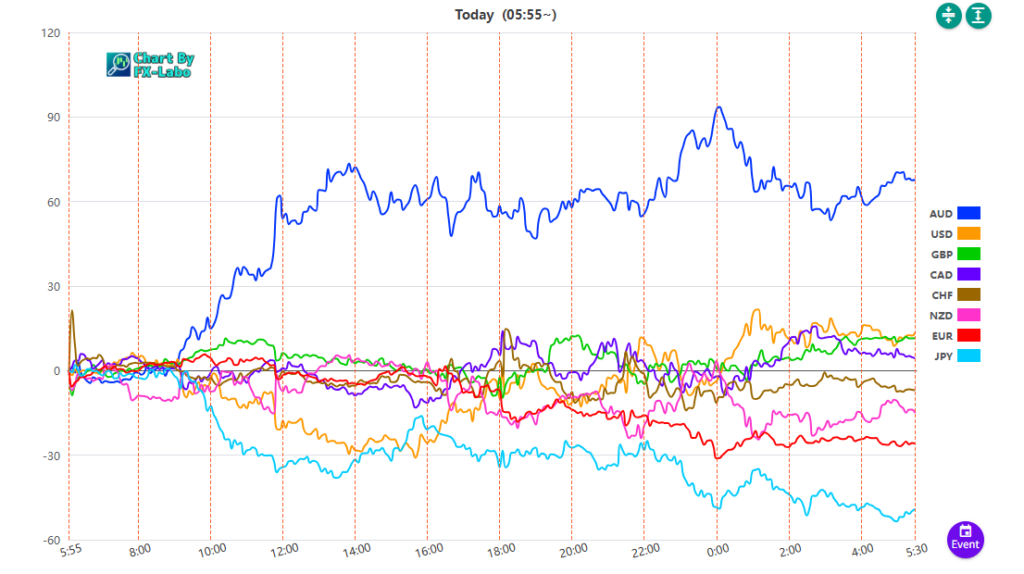 上は、11日の通貨強弱。東京時間に豪ドルが大きく買い、円は売りとなりました。