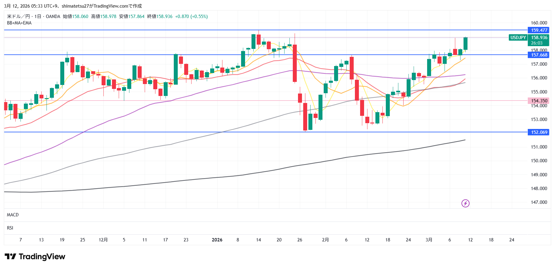 ドル円の日足チャート。3/12 6:00のレートは158.93。上のラインは159.47。下は154.35となります。注目のラインは157.67付近。ここから上はレートチェックや介入が警戒されるレベル。