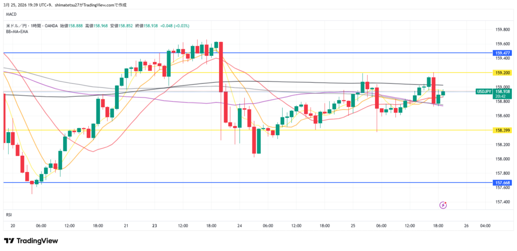 ドル円の1時間足チャート。3/25 18:00のレートは158.77。本日は上は159.2、下は158.4のレンジになっています。スキャルやデイトレはこの黄色と青のラインを意識したいですね。